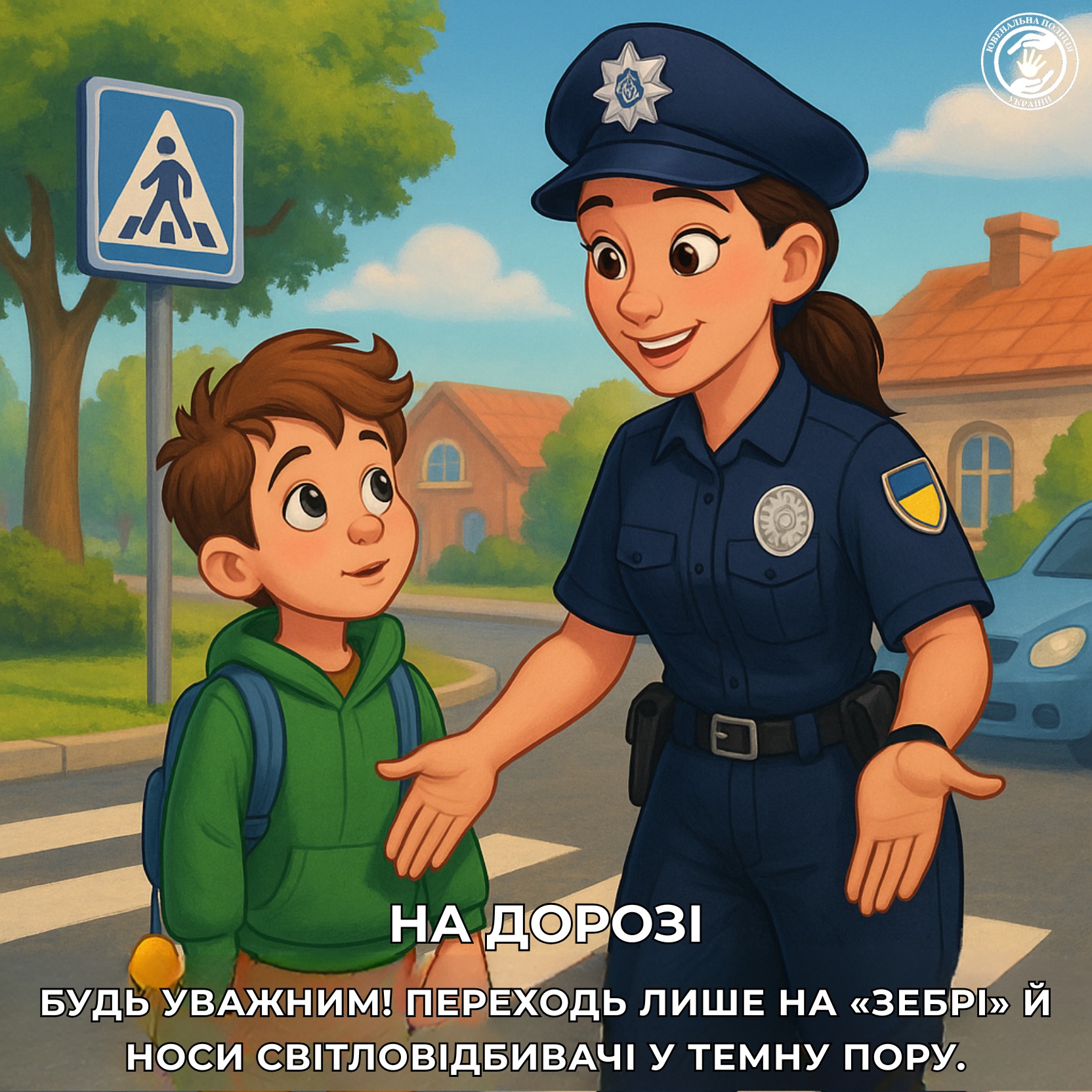 Переходь дорогу лише на пішохідному переході, будь уважним і не грайся біля проїжджої частини. У темну пору доби носи світловідбивні елементи, щоб бути помітним водіям.