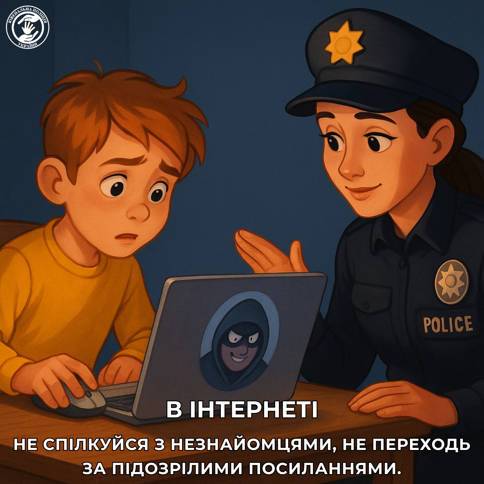 Не спілкуйся з незнайомцями онлайн, не переходь за сумнівними посиланнями й не надсилай особистих фото чи відео. Якщо отримав підозріле повідомлення – розкажи дорослим або звернись до поліції.